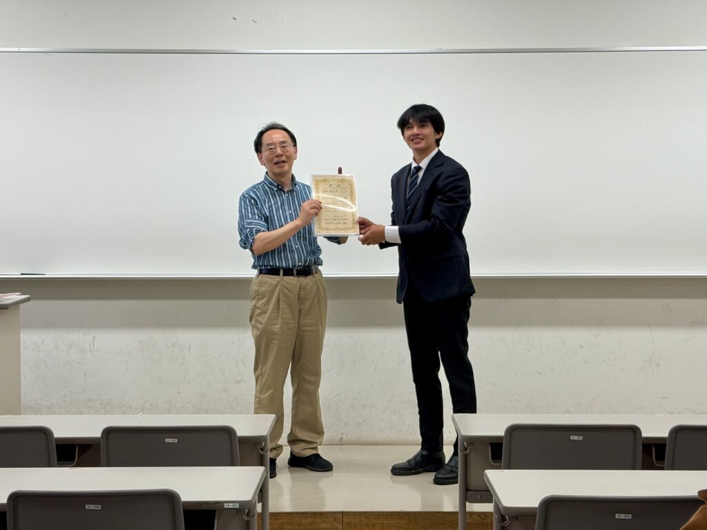 ホームお知らせ 修士課程中間発表優秀発表賞受賞 2025年11月13日 2025年10月1日 水理研究室の修士課程2年Malone Luke Estavillo Montereyさんが、修士課程1年次の中間発表において「前原康夫賞(優秀発表賞)」を受賞しました。 この受賞は、土木・環境工学分野における優れた研究成果と発表能力が高く評価されたものです。 発表題目:「3次元水理シミュレーションによる小河内貯水池における風の影響を受けた濁度放流の解析」 表彰式にて